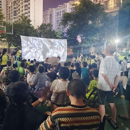 露天播放電影的形式,自由隨意的觀影氣氛,讓觀影人員更真切的體驗艱苦奮斗的那個年代,革命先輩的付出與奮斗。放映活動現(xiàn)場反響熱烈,夜幕降臨,現(xiàn)場座無虛席。業(yè)主們有的自帶板凳、有的駐足站立、有的直接席地而坐。物業(yè)工作人員精心布置著場地,還為業(yè)主準(zhǔn)備觀影小零食,業(yè)主們嗑著瓜子、吃著冰棍,都全神貫注地融入到劇情里,仿佛身臨其境。